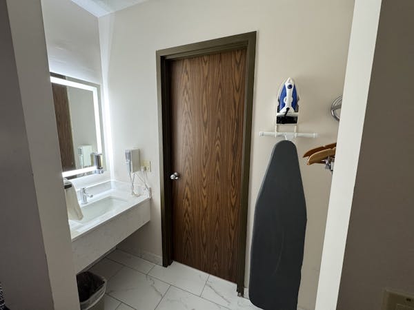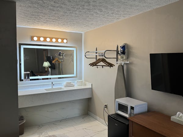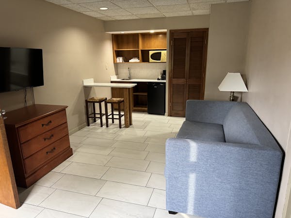 Enjoy modern comforts like a refrigerator, microwave, and stylish furnishings, all enhanced by cozy carpeting. Complimentary bottled water is provided upon arrival.