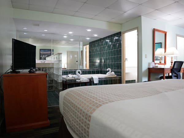 Click for a video tour! Unwind in style in our exclusive King Jacuzzi Suite. Featuring a king-size bed and a private in-room jacuzzi, this spacious poolside haven is the perfect couple's retreat.