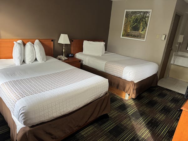 Click here for a video tour. Enjoy the flexibility and comfort of our spacious Two-Room Poolside Family Suite. Perfect for families, this suite features two comfortable full-size beds in the separate bedroom and a convenient pull-out sofa in the living area, easily accommodating up to 6 guests.